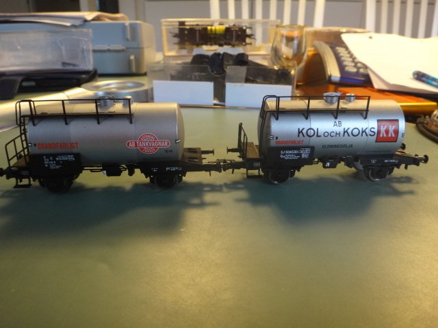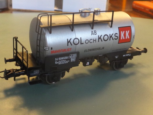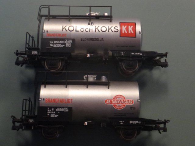 Sæt med to tankvogne fra SJ. Den enee er fra AB Kol och Koks med omfagttende åtryk på tank og undervogn.