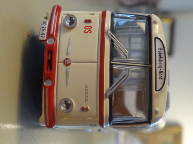 Model fra brekina af en Skoda-trolleyvogn type 9 Tr fra Potsdam. Meget flot dekoreret model med mange ppåtryk og detaljer. De to trolleystænger kan forsigtigt løsnes fra deres holdere.