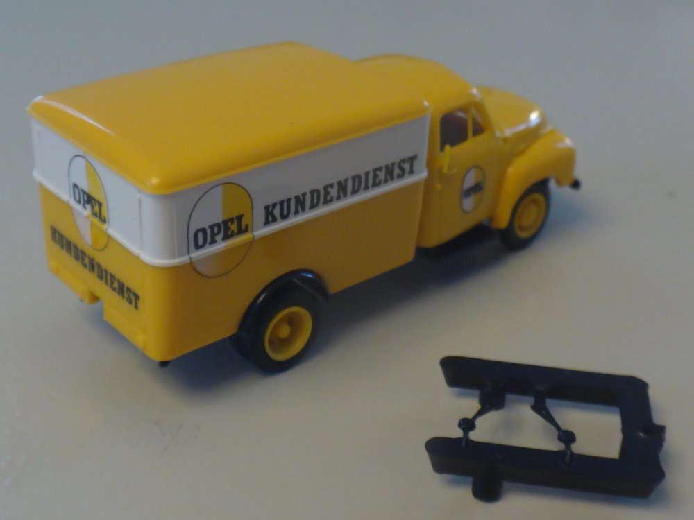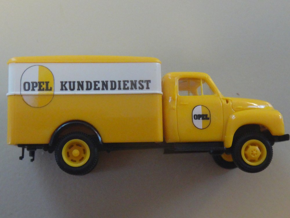 Meget smuk Opel Blitz med 'egenreklame' for Opel Kundendienst. Gul/hvid vogn med nydelige påtryk. Vedlagt løse sidespejle.