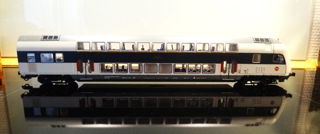 DSB's dobbeltdækkervogne litra ABS-BK-B-B i helt ny udgave fra Roco. Vognene er 100 % korrekte hvad angår længde, bemaling, udførelse og påtryk - dørmarkeringerne er f.eks, røde, og der er vognnummer på fronten af ABs-styrevognen. Det anskudte 'vingehjul' er erstattet af DSB-bolsjet.