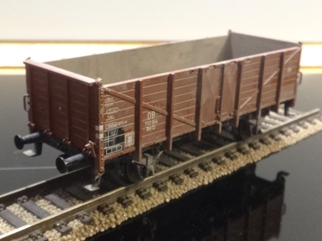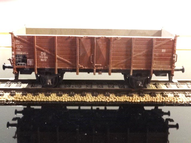 En helt almindelig, højsidet åben godsvogn litra Om 12 fra DB - næsten identisk med DSB litra PT. Fint patineret Roco-model i æske og køreklar-