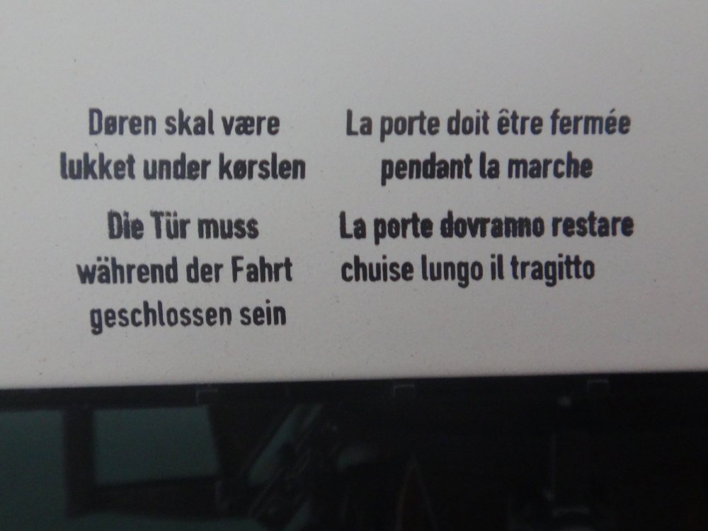 Påskrifterne var også specielle, for lukkeanvisningen til dørene stod på fire sprog - dansk, tysk, fransk og italiensk. Bemærk, ingen kerede sig om engelsk dengang - hvad skulle man dog med det i Kontinental-Europa?