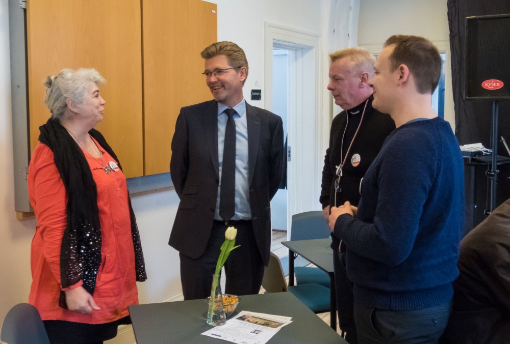 Københavns overborgmester, Frank Jensen, kom på besøg i dagens anledning. Her taler han med (fra venstre) Manja Sand og også Frank Jensen (henholdsvis kasserer og formand for Foreningshuset Sundholm8) og Teddy Sidelmann Rasmussen, der er huskoordina Portræt: Frivillighed skal gøre glad25-02-2015 Ildsjæl med hjertet på rette sted