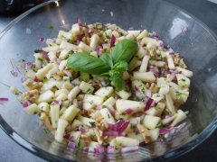 Herefter hakkes de groft og blandes med æble/løg blandingen.