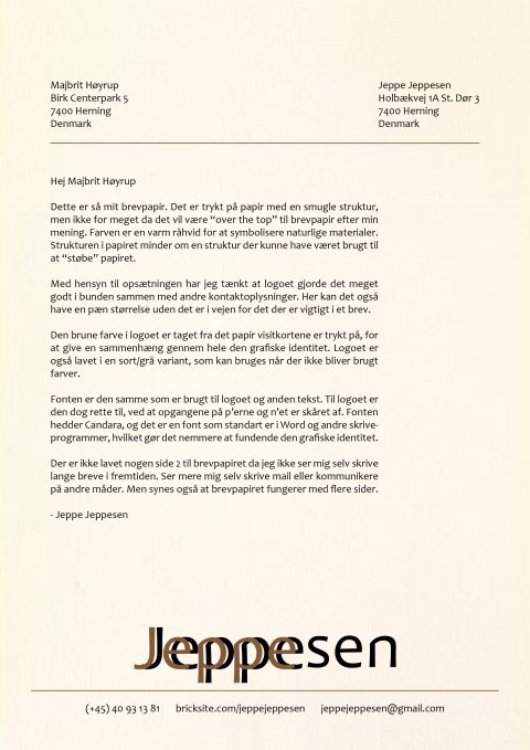 Da mit navn jo er lidt specielt ved at det er en gentagelse ville det være oplagt at bruge dette i logoet. Jeg startede med at kigge på en masse fonts, og fandt frem til en jeg næsten var tilfreds med, men dog ikke helt. Det er fonten der hedder Candara, men jeg var ikke helt tilfreds på "opgangene" der var på nogle af bogstaverne, så jeg rette fonten til og fjernede "opgangene". Denne tilrettet font brugte jeg så til at skrive mit navn med, ved at lægge Jeppe oven på Jeppesen.