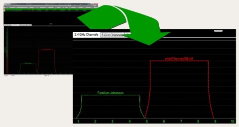 I det viste eksempel ligger de to netværk perfekt ved siden af hinanden. Havde det grønne netværk lappet over det røde, kunne det være nødvendigt at flytte kanal for ejeren af det røde signal (som hører til den husstand, der måles på). Det rødt markerede netværk ligger på kanal 7. Læg mærke til, at et netværk typisk spreder sig over 5 kanaler.
