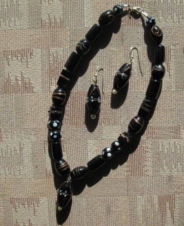 1 par øreringe af unikke sorte håndlavede glas keramikperler. Der er en enkelt hvid plastperle i bunden (så de matcher vedhænget på den tilsvarende halskæde)