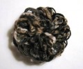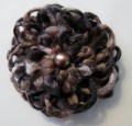 Broche (se foto1) m/ garnblomst i brune mosaik-farver. Den har ingen perle i midten.  Brochenål limet bagpå.  P.t. 1 stk.