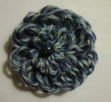 Broche m/ garnblomst i blå-stribet garn. Jeg har 1 stk. m/ en blå perle i midten (se foto) og 1 stk. uden perle i midten.