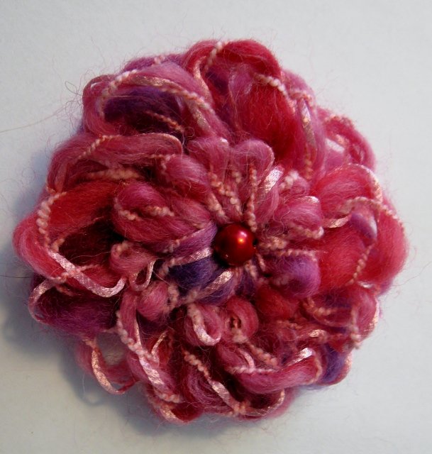 Garnblomst som broche. Med flot lyserødt effektgarn og højrød perle i midten. Brochenål bagpå.