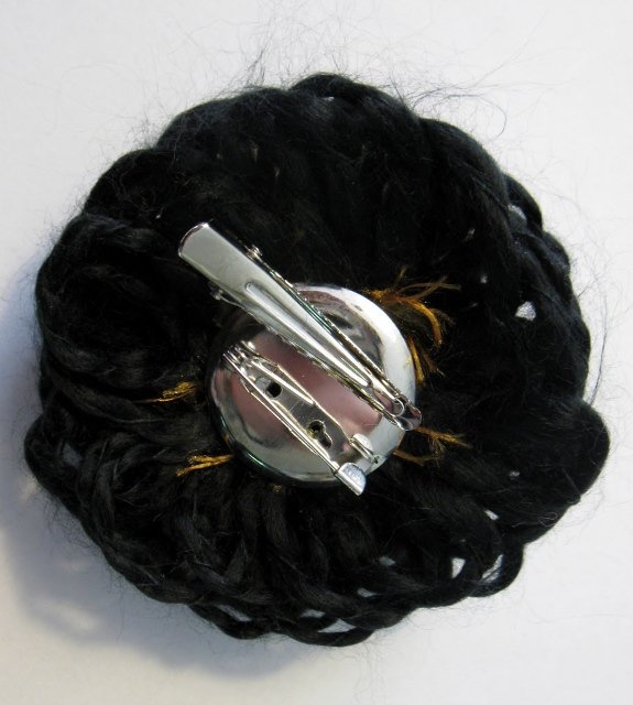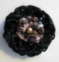 Garnblomst som broche. Sort med brun-mix øverst og gylden perle i midten. Speciel brochenål bagpå, hvor man kan vælge mellem nål og klemme.