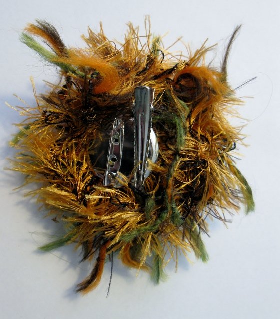 Garnblomst som broche. Af gyldent effekt-garn m/ 3 perler påsyet i midten. På bagsiden er pålimet en speciel brochenål, hvor du selv kan vælge mellem nål eller klemme. (se fotos)