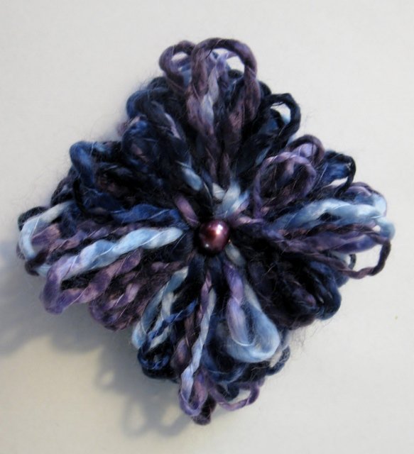 Garnblomst som broche. Lilla-mix m/matchende perle påsyet i midten. Firkantet model. Der er pålimet brochenål på bagsiden.