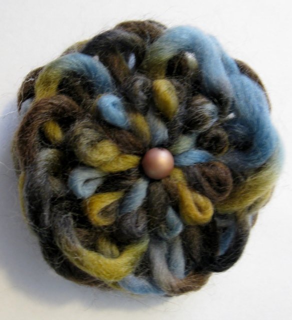 Garnblomst som broche. I uld-mix garn. Farver: blå, brun, gylden. Der er en gylden perle påsyet i midten, og en brochenål pålimet på bagsiden.