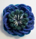 Garnblomster som brocher. Af multi-farvet garn - her grøn, blå og hvid. Der er brugt det samme garn, men som det ses på foto, bliver garnblomsterne meget forskellige.