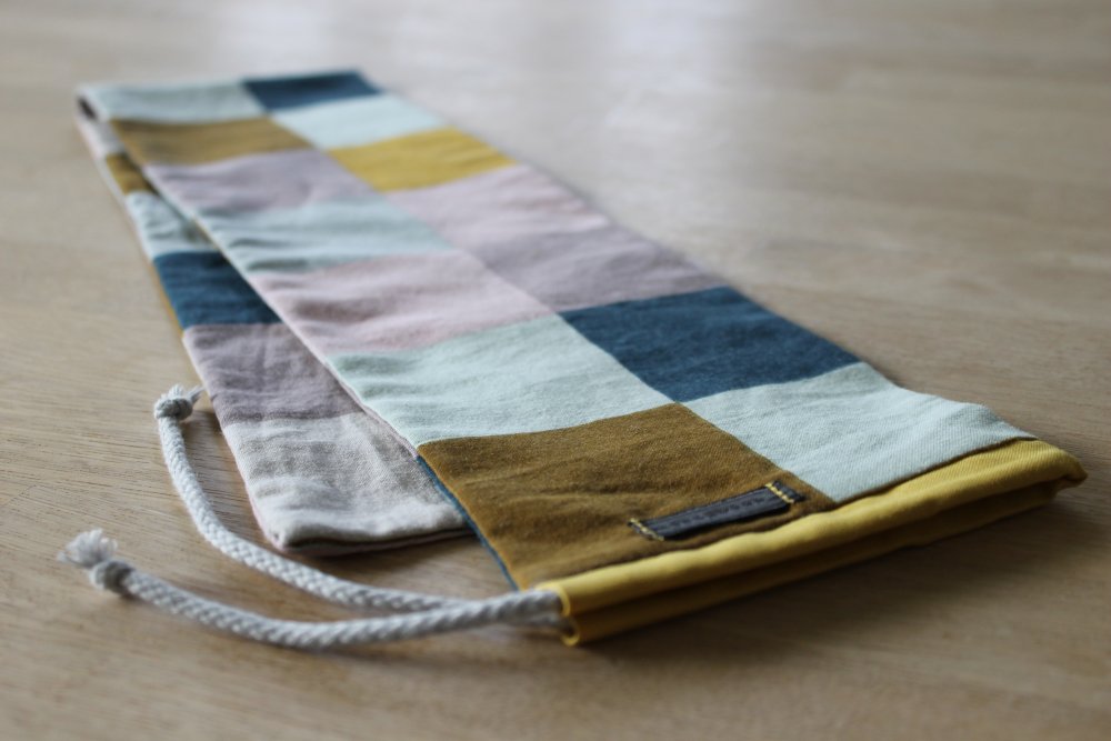 Syet i ternet bomuldsstof med bindebånd i enden til lukning.