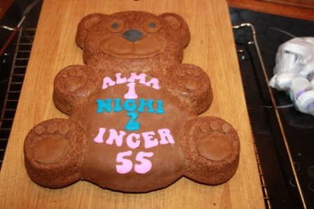 1 år var gået og min kære datter havde fødselsdag. Kagen var til dagplejen, hvor Nichi og dagplejemor Inger også havde fødselsdag. Havde aftalt med Nichi mor at jeg lavede kage og hun tog frugt med også overraskde vi inger med og skrive hende på den også. De var så glade for Squachkagen at jeg måtte af med opskriften. Den smuldrede ikke så meget.