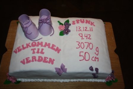 Kagen til SPUNK...Vores venner kunne ikke rigtig finde et navn til deres lille pige og da vi hele graviditeten havde kaldt baby for spunk, ja, så måtte der jo stå det på kagen. Kagen havde jeg sat i deres køleskab, så de blev glædeligt overrasket da de kom hjem fra sygehuset.