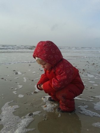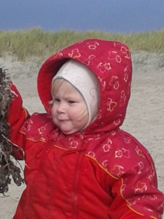 Efter morgenmaden gik vi os en god tur til vandet. En tur på godt 5 km., men hvor var det bare dejligt og blive luftet og blæst igennem nede på stranden.  Alma nød og lege med tang og sten i vandkanten og hvis hun kunne komme til det, løb hun en tur ud i vandet.