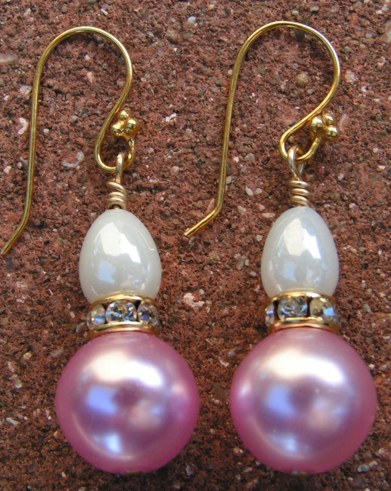 Guldbelagte ørekroge med hvid voks, rhinstensmellemled og lyserød perlemor.