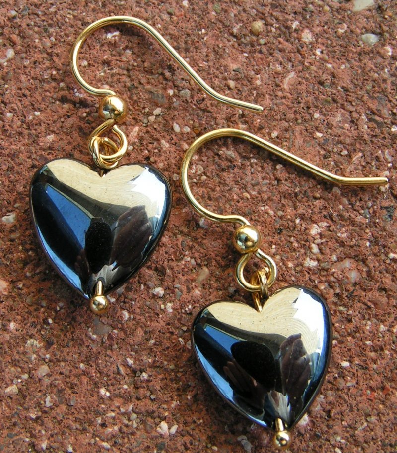Guldbelagte ørekroge med onyks hjerter.