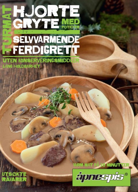 Ingredienser:19 % hjortekjøtt, poteter, løk, sjampinjong, skummet melk, vegetabilsk olje, fløte, salt og krydder.