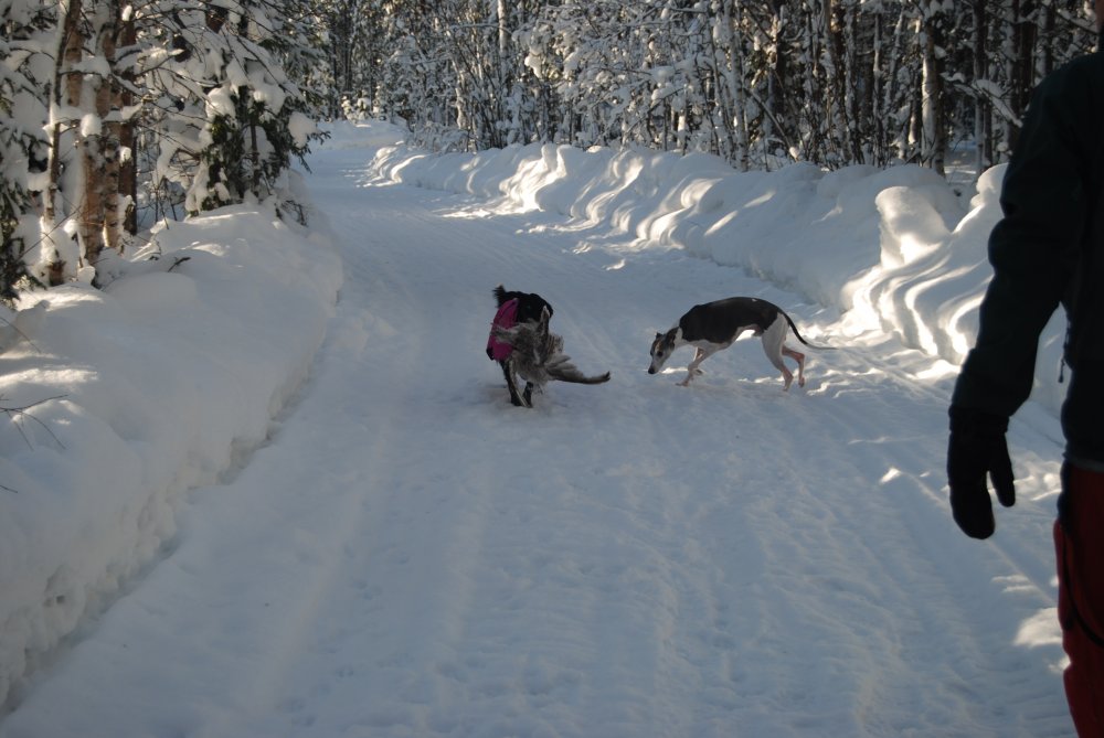 Hon är duktig på inkallning och vi håller nu på att utöka svårighetsgraderna där med mera störning. Vi tränar stanna i olika miljöer och situationer och det har hon blivit väldigt duktig på. Hon stannar och sätter sig nu på håll och i situationer med störning. Eftersom hon redan nu har börjat intressera sig för småfåglar har vi fått nytta av vår träning, hon sätter sig fint på stanna även fast det flyger sparvar framför sammetsnosen.