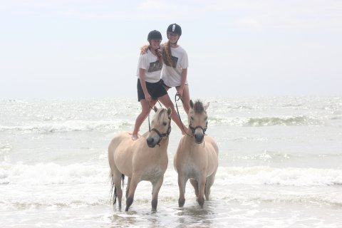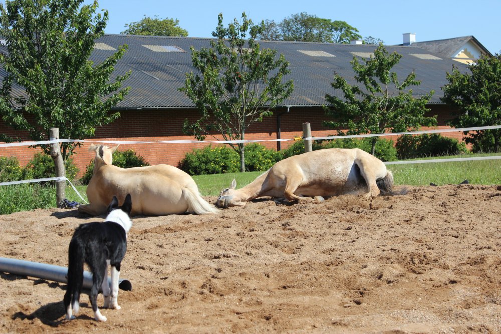 Freja(t.v) og Lippa(t.h) ligger og slapper af på ridebanen.