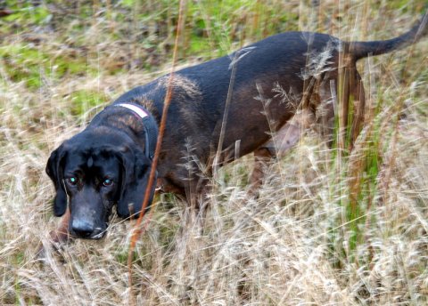 Mads blev aldrig udstillet eller kom på schweissprøve, det var ligesom ikke så væsentligt, Det første års tid Mads boede hos mig handlede bare om at lære ham alle de ting, han skulle have lært som hvalp og unghund. Og da det var lykkedes var han 5 år, og jeg syntes han havde haft så hårdt et liv, at jeg ikke ville begynde at tage ham med på udstillinger og prøver. Så Mads fik bare lov at arbejde på schweiss herhjemme, og det var han ikke alene rigtig god til, han elskede det også i den helt særlige grad man tit ser hos hunde, som har været forsømte og så pludselig opdager at livet kan byde på andet og mere end en trist hundegård og ligegyldige og dumme mennesker.