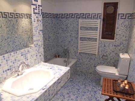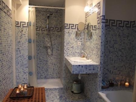 Badet er lyst og sydlansk inspireret med både brus og karbad.