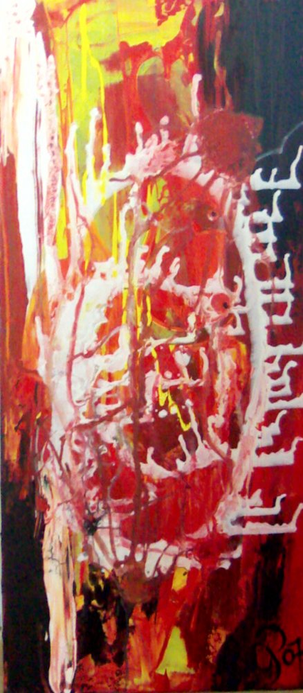 Maleriet er malet med akryl maling. Farverne som er brugt er Rød, gul, brun, sort og hvid. Maleriet er abstrakt malet.
