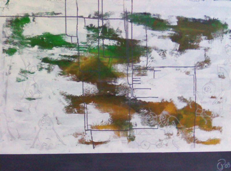 Maleriet er malet med akryl maling. Farverne som er brugt er grøn, gul, brun, rød, hvid og grå. Maleriet er abstrakt malet, dog med enkelte figurative elementer i. Maleriet er uden ramme, da det er 4 cm tykst, og derfor præsentere sig bedre uden. Maleriet er larkeret.