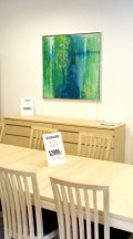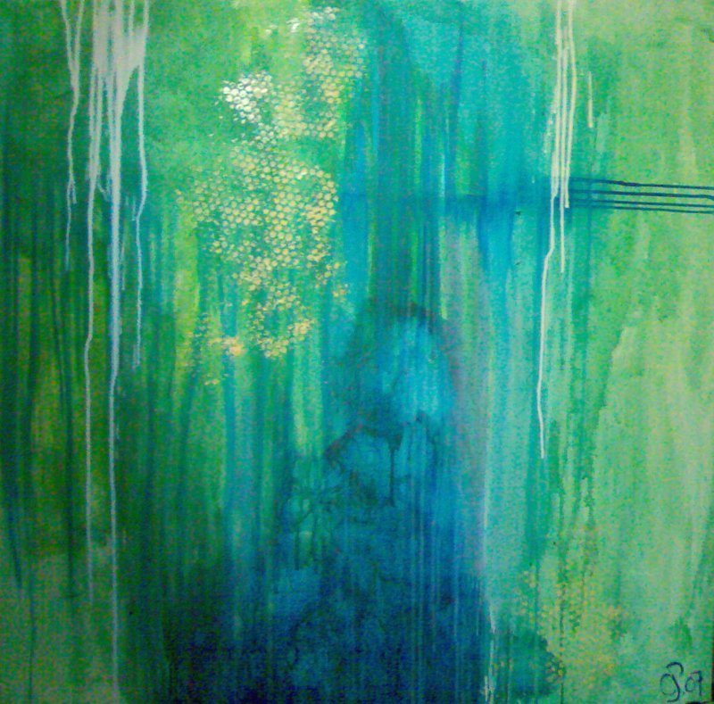 Maleriet er malet med akryl maling. Farverne som er brugt er grøn, blå, sort og hvid. Maleriet er abstrakt malet. Maleriet er incl. sølv svæveramme. Maleriet er larkeret.