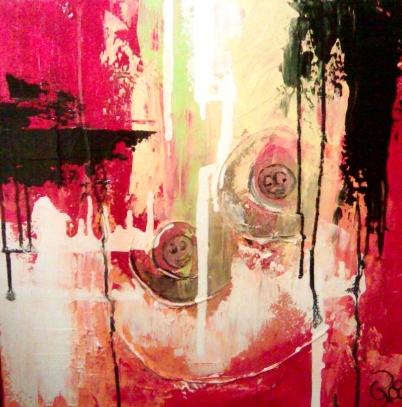 maleriet er malet med akryl maling. Farverne som er brugt er rød, gul, orange, sort, grøn og hvid. Maleriet er abstrakt malet, dog med enkelte figurative elementer i. Maleriet er incl. sølv svæveramme. Maleriet er larkeret.