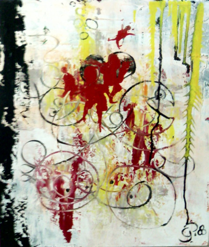 Maleriet er malet med akryl maling. Farverne som er brugt er rød, gul, hvid, sort og orange. Maleriet er abstrakt malet. Maleriet er incl. sort svæveramme. Maleriet er larkeret.