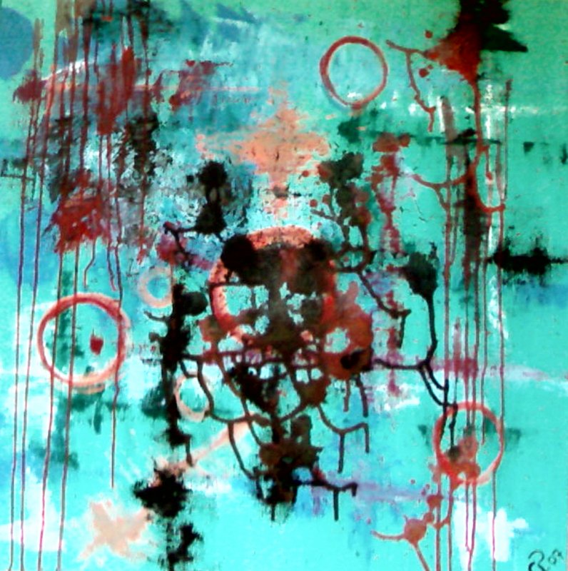 Maleriet er malet i akryl maling. Farverne som er brugt er Grøn, hvid, blå sort rød og orange. Maleriet er abstrakt malet. Maleriet er incl. sølv svæveramme. Maleriet er larkeret