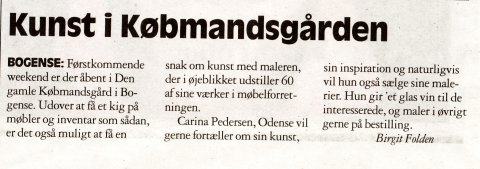 Kunstudstilling.Kunstner Carina Pedersen udstiller sine malerier i Den gamle købmandsgård i Bogense. De udstillede malerier er en blanding af det figurative og det abstrakte. Carinas malerier kan købes der nede. Læs mere. Man. d. 17. marts til søn. d. 31. august 2008 (Fri entré) Den gamle købmandsgård, Østergade 19, Bogense