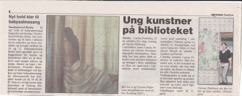 Ung kunstner på biblioteket. Næsby: Carina Pedersen, 22 år, udstiller fra idag, onsdag på næsby bibliotek. I øjeblikket læser Carina Pedersen på Odense socialpædagogiske seminarium, samtidig har hun siden 2000 arbejdet som selvlærd kunstner, og deltaget i flere udstillinger. Hun var også med i ugeavisens store malerkonkurrence med udstilling i rådhushallen i Odense, og har nu dannet kunstgruppen ved navn Opus-art. Siden har hun blevet tilbudt og udstille i London og firenze. I næsby udstiller Carina Pedersen 16 malerier. Hun fortæller selv at der kommer en ro over hende når hun står og maler, og denne ro afspejles ofte i hendes malerier. Ynglingsmåden at male på er at anvende spartel og pensel. Hun afprøver hele tiden nye metoder, og maler såvel figurativt som abstrakt. Udstillingen varer til d. 11 april.