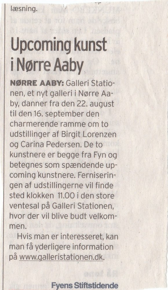 NØRRE AABY: Onsdag den 22. august er der i det nye Galleri Stationen i Nørre Aaby på Fyn fernisering på en særudstilling med de to kunstnere Birgit Lorenzen og Carina Pedersen. Begge to interessante er fynske kunstnere på vej frem.
