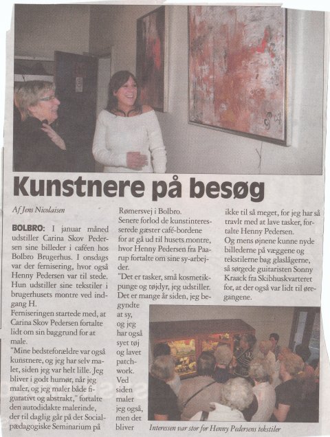 Malerieriudstilling. Carina Pedersen er autodidakt kunstner siden år 2000. Hendes malerier er figurative så vel som abstrakte, og ofte holdt i en enkelt farvetone, eksempelvist blå og grøn, og nuanceret ved hjælp af hvid og sort. On 2 januari 2008 till to 31 januari 2008, Man-tor kl. 8.30-16 og kl. 19-21 og fre. kl. 8.30-14. (Fri entré) Bolbro Brugerhus, Stadionvej 50, Bolbro, Odense V