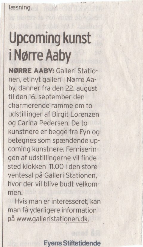 Onsdag d. 22 august er der i det nye Galleri Stationen, i Nørre Åby på Fyn, fernisering på en særudstilling for de to kunstnere Birgit Lorenzen og Carina Pedersen. Begge to interessante up-coming fynske kunstnere, hvis malestil bl.a. er hverdagsstemninger.
