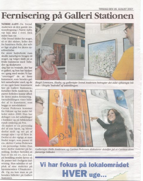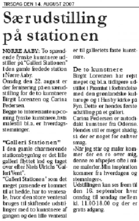 Særudstilling. De to fynske kunstner Birgit Lorenzen og Carina Pedersen udstiller deres malerier i den store ventesal. Ons. d. 22. august til søn. d. 16. september 2007, kl. 11 til 18. (Fri entré) Galleri Stationen, Jernbanevej 4, Nørre Aaby