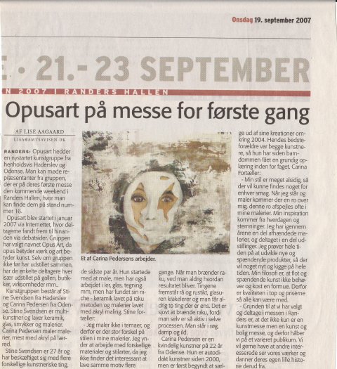 Kunstgruppen Opusart udstiller.På Kunst og bolig messen i Randers. Kunstgruppen består af to kunstnere Stine Svendsen, haderslev og Carina Pedersen, Odense. Vi er at finde ved stand 16. Der vil være maleri, keramik og smykker. Alle unikke værker. Kig forbi. Fre. d. 21. til søn. d. 23. september 2007, kl. 13-18, 10-17. (Entré: 70) Randershallen, Sjællandsgade 57, Randers