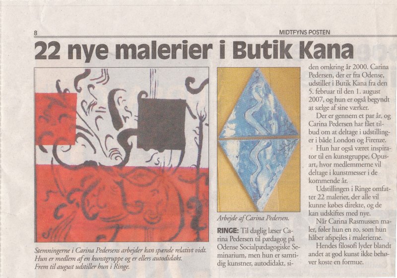 Ringe: Til daglig læser Carina Pedersen til pædagog på Odense Socialpædagogiske Seminarium, men hun er samtidig kunstner, autodidakt, siden omkring år 2000. Carina Pedersen, der er fra Odense, udstiller i Butik Kana fra den 5. februar til den 1. august 2007, og hun er også begyndt at sælge af sine værker.