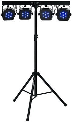 bestående af 4 slanke LED spotlights, 1 overliggeren med integreret DMX styring, 1 fod-controller med 10 m tilslutningskabel og 1 lys stå.