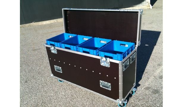 Housebox med målene L:125 B:40 H:60. Inden i kassen, er der fastgjort 2 skinner, 1 i hver side, til placering af de 4 plastkasser som indsats. Denne type kan udover indsatskasserne, også beklædes med skum, og evt. skillerum i den nederste del af kassen. Kassen er selvfølgelig med 4 hjul, 2 fliphåndtag i hver ende, låse og lid-stays. Som udgangspunkt bygges ALLE Houseboxe i 9mm finér.