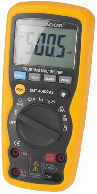 DMT-4010RMS Digital multimeterDigital multimeter, til professionel brug. Sand RMS målemetode Beskyttet mod støv og vand i henhold til IP67, når test stikkene er dækket Autoranging for hurtigere målinger Opløsning: 4.000 cifre Yderligere søjlediagram Spænding måling: op til 1.000 V DC current / ~ Strømmåling: op til 10A DC current / ~ Frekvens måling: op til 10MHz Resistance måling: op til 40MΩ Kapacitansmålingen: op til 40mF Temperatur måling: -20 ° C til 760 ° C Akustisk kontinuitet test diode test Data hold (lagring af målte værdi) Peak hold Registrering af max. værdi og min. værdi LCD med omstillelig baggrundslys Automatisk afbrydelse overbelastningsbeskyttelse Leveres med testledninger og beskyttende pose