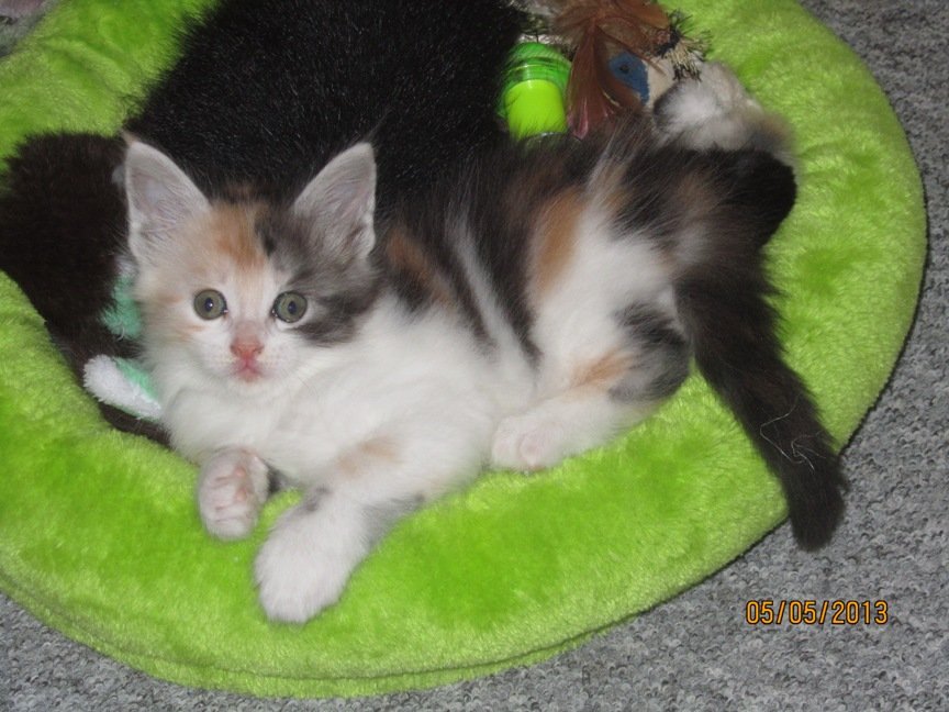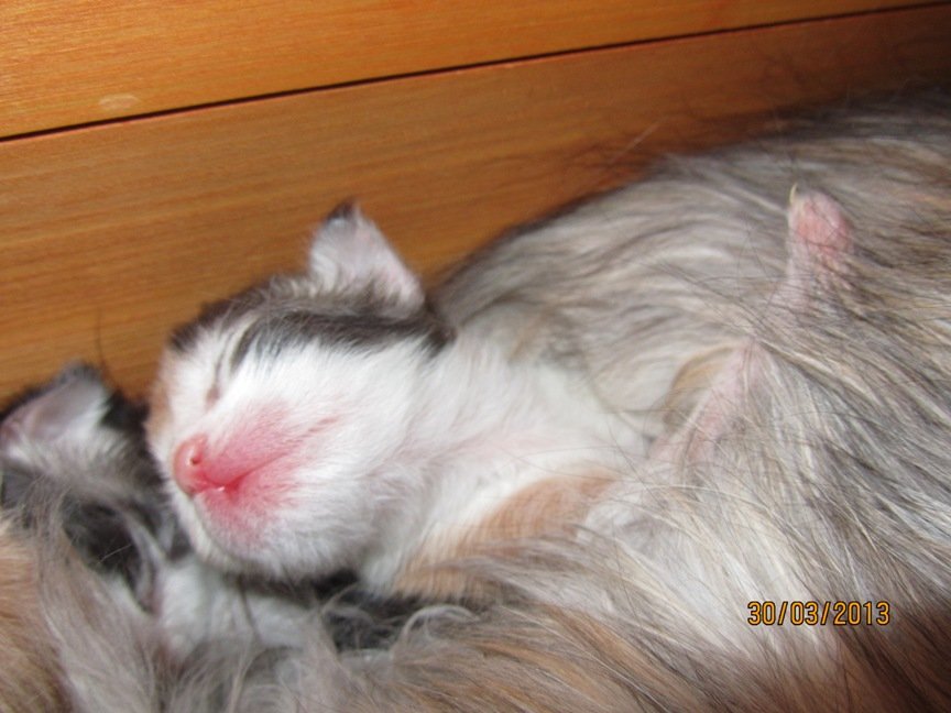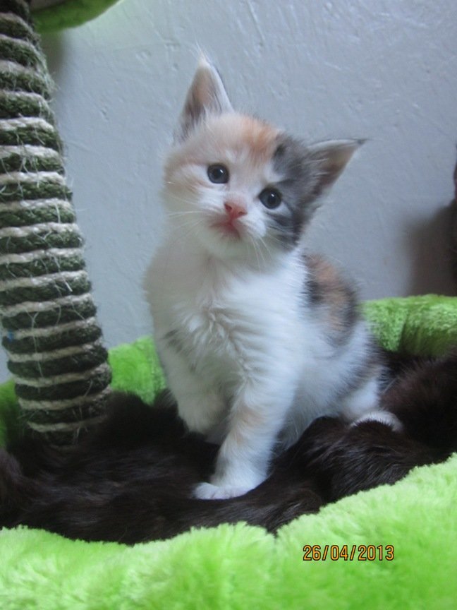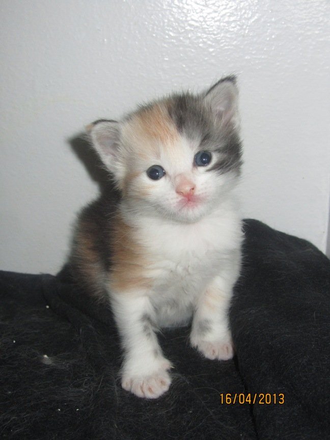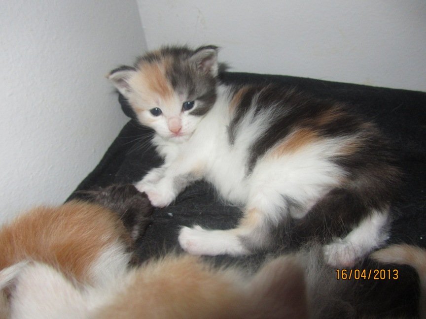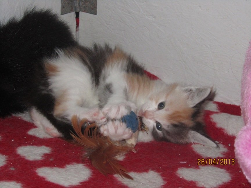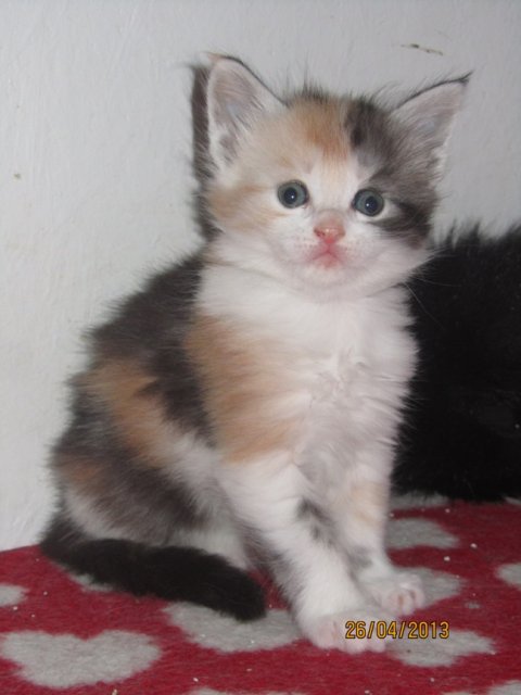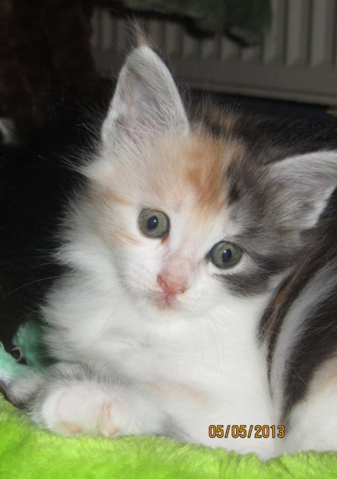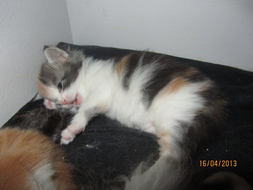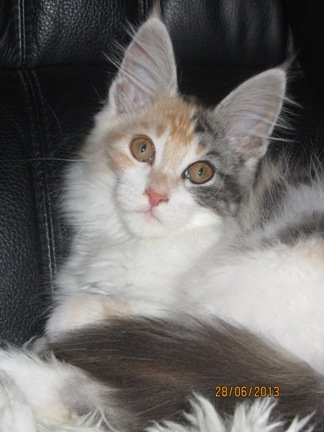 Bicolour sort tortie sølv blotched tabby med hvid.