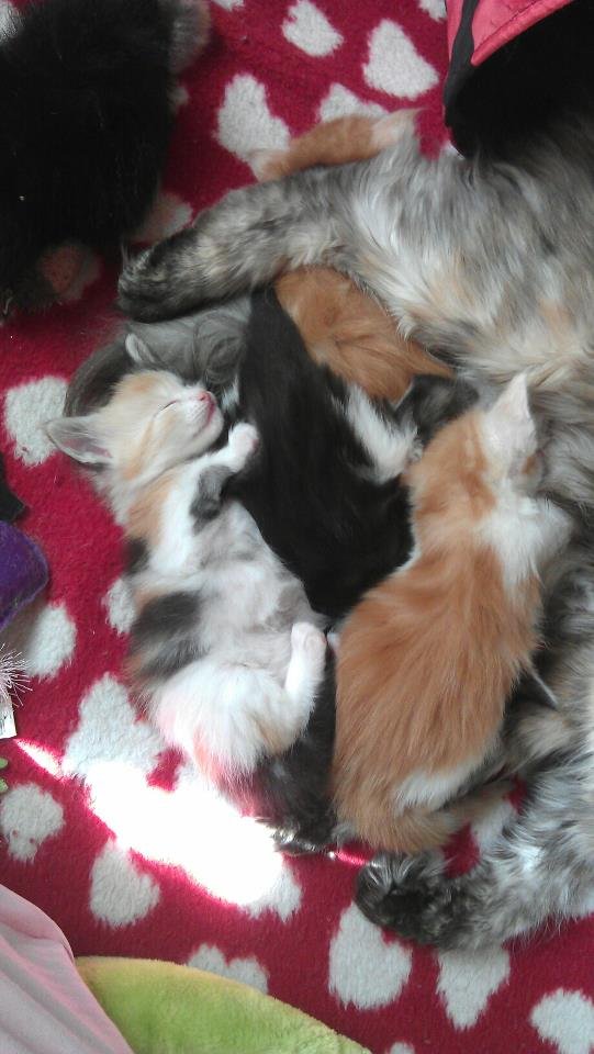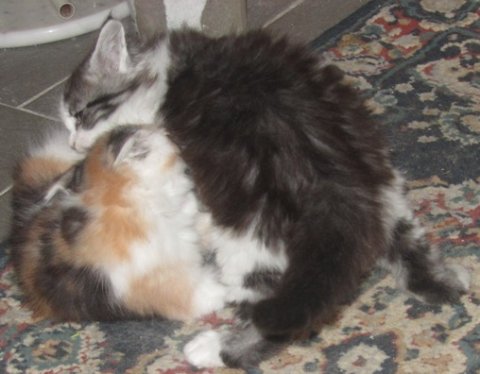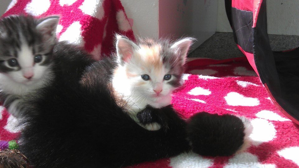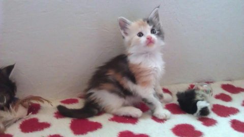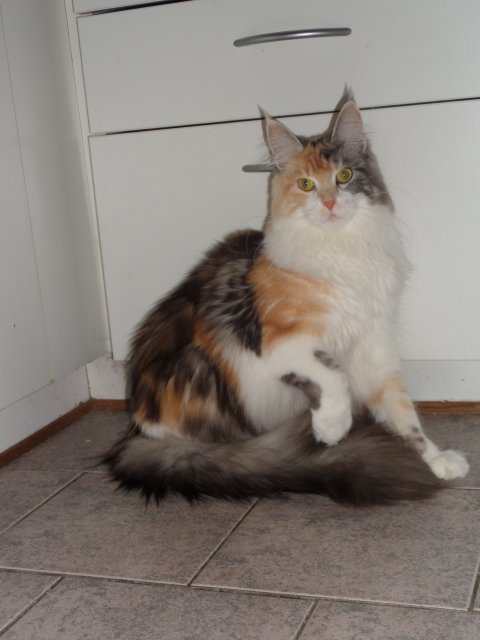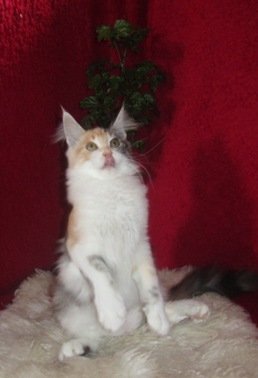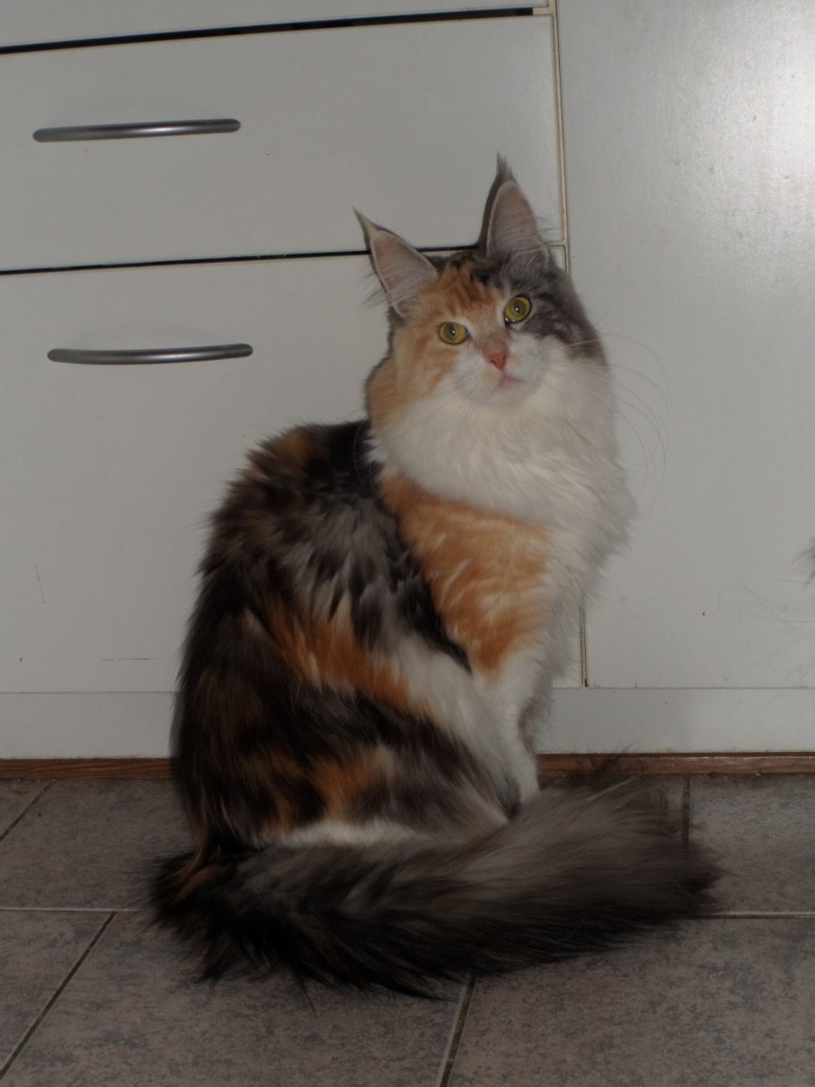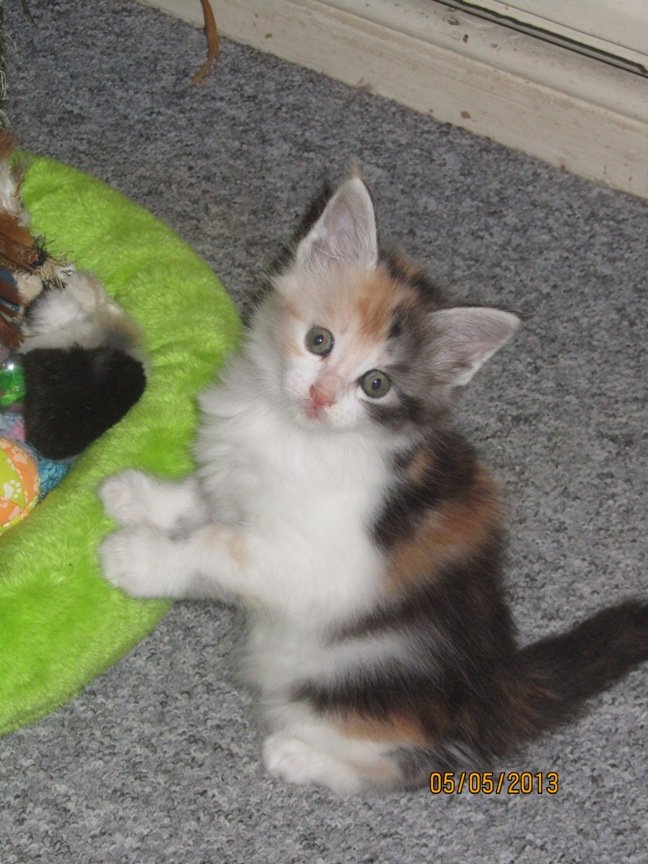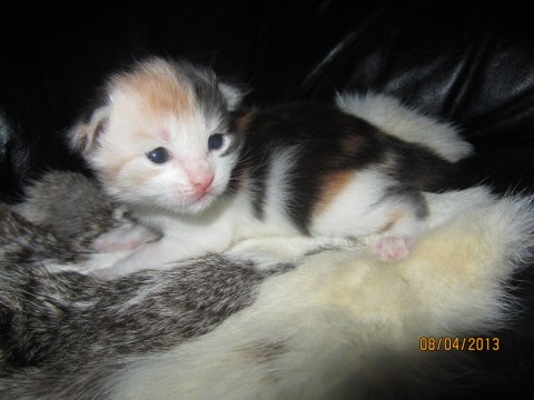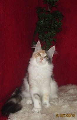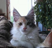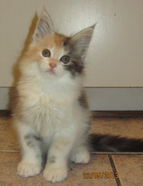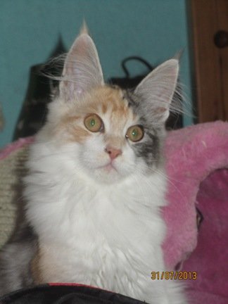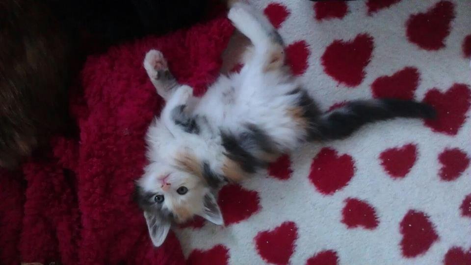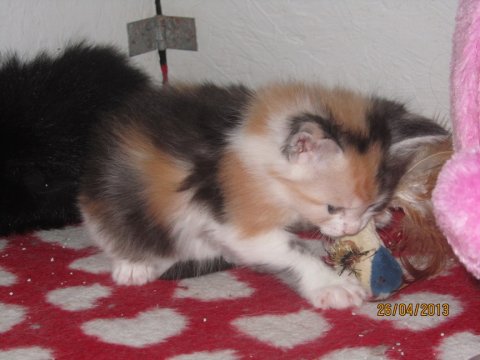 Bicolour sort tortie sølv blotched tabby med hvid.