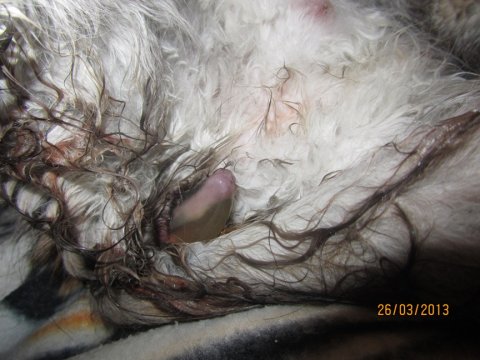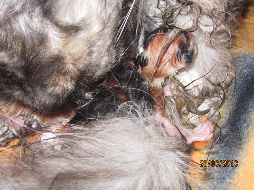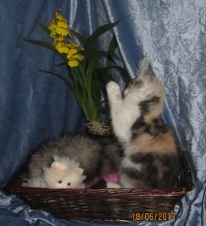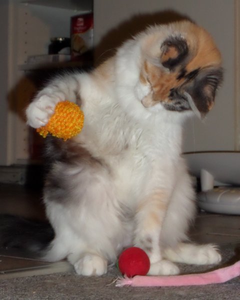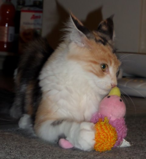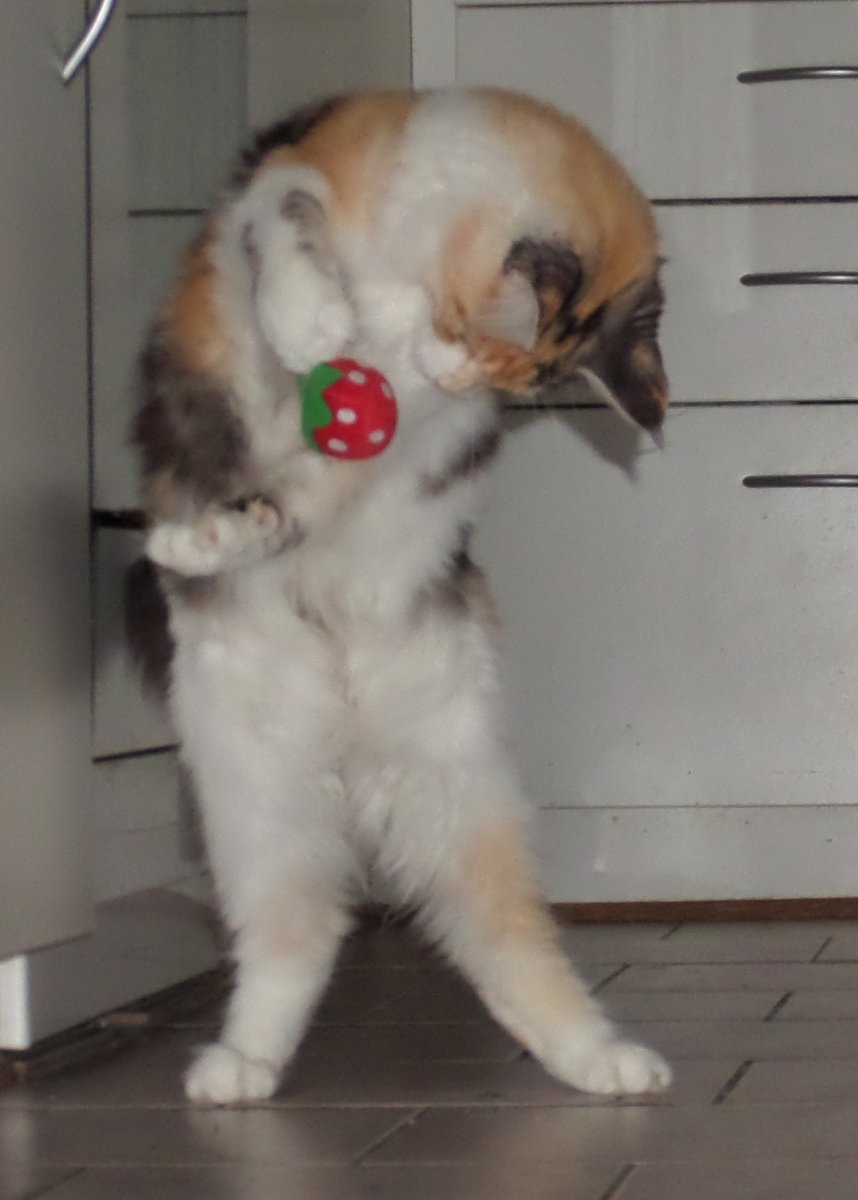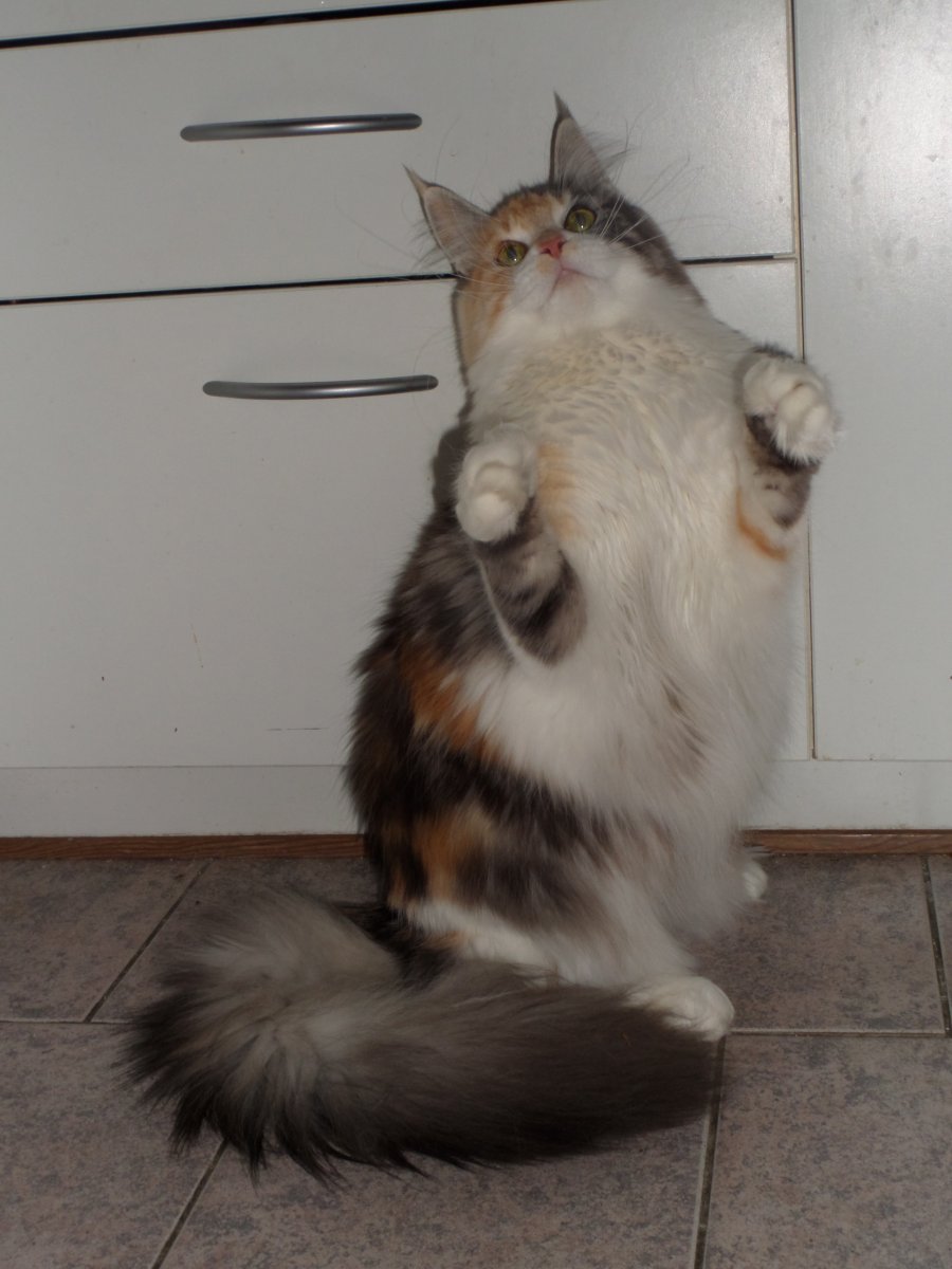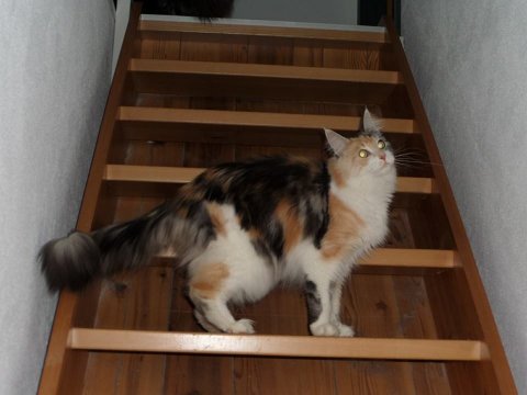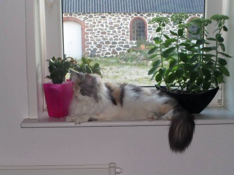 Hun er dog lidt som hendes far, da han var killing, men er bange for højder, så når man skal nusse hende, så er det nede fra...